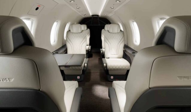 Scaunele pivotante și finisajele inspirate de avionul PC-24 garantează un confort de avion, cu spațiu generos pentru picioare, rafturi retractabile și acces direct la compartimentul de bagaje presurizat, chiar și în timpul zborului.